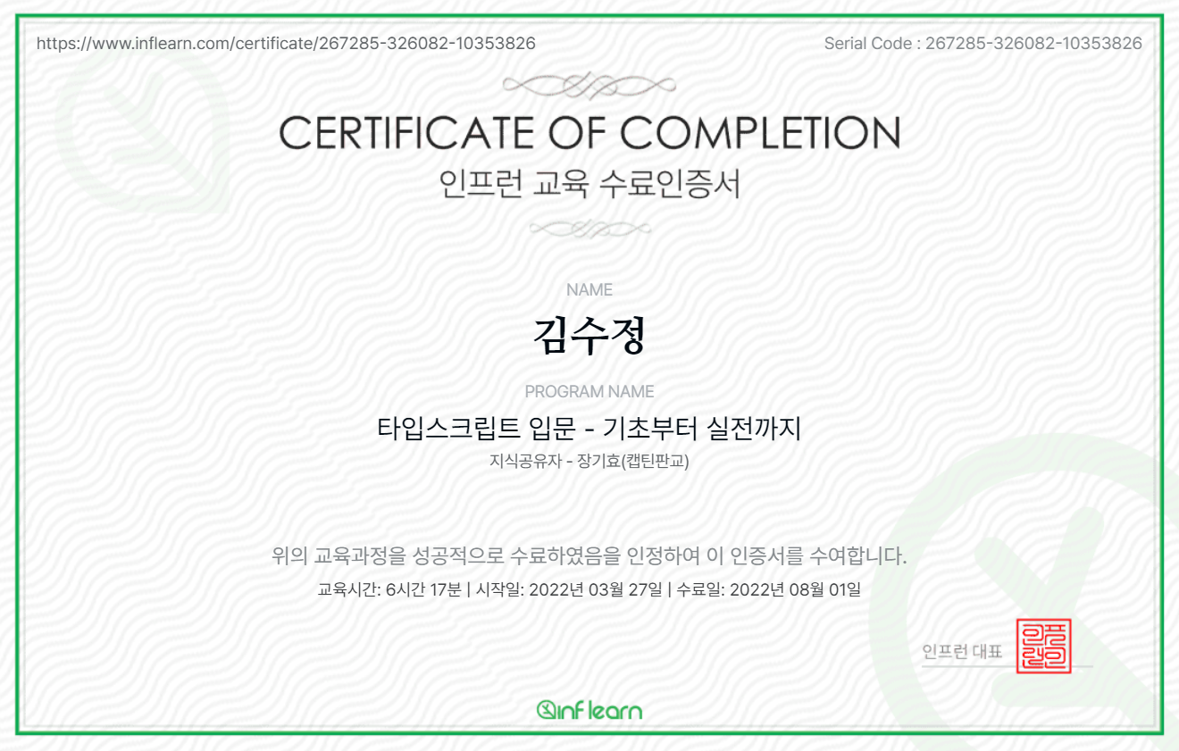 본론 4학년 1학기 개강 전, 타입스크립트 강의를 들어야겠다고 다짐했을 때 캡틴 판교 님의 "타입스크립트 입문 - 기초부터 실전까지" 를 결제했었는데, 미뤄지다가 드디어 수료를 완료했습니다. 프로젝트를 할 땐 필요한 것 위주로 살펴봤었기에 몰랐던 부분도 많았고, 실질적인 활용법도 익힐 수 있어서 만족스러운 강의였습니다. 해당 내용에 대한 필기는 OOPY라는 노션 공유 사이트를 통해 추후에 올려볼까 합니다...! 아직은 많이 꾸며지지 않아 아쉬운 부분이 많아요 ㅠㅠ... 아무튼 다들 캡틴판교님 강의 들어보세요!! 하나하나의 분량이 짧아서 부담스럽지도 않고, 이해하는데 무리없이 정의와 특징, 예시를 차례대로 설명해주셔서 정말 좋습니다. 저처럼 인강이 효율적이지만 인강을 오래 못보는 분들이라면 더더욱 잘 맞을..
