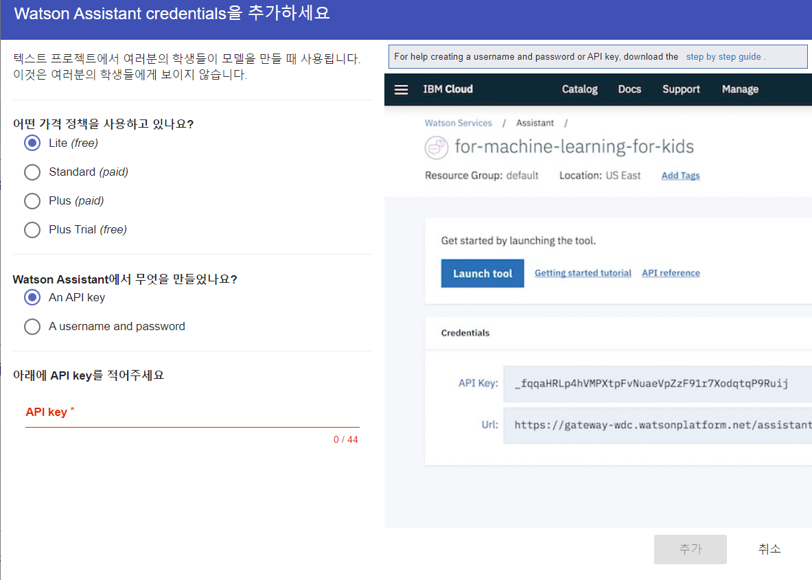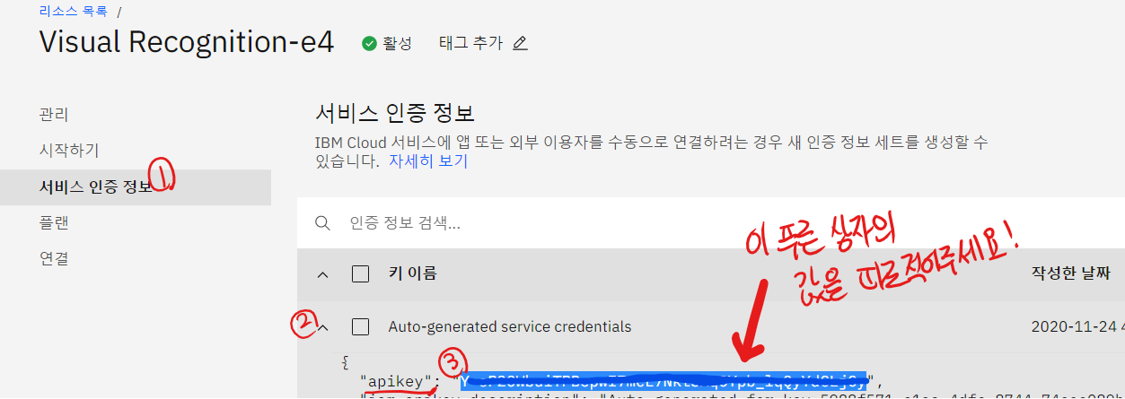 visual Recoginition과 Watson Assistant 모두 위와 같이 서비스 인증 정보 > auto-generated service credentials 확장 > apikey 값 따로 적어두기