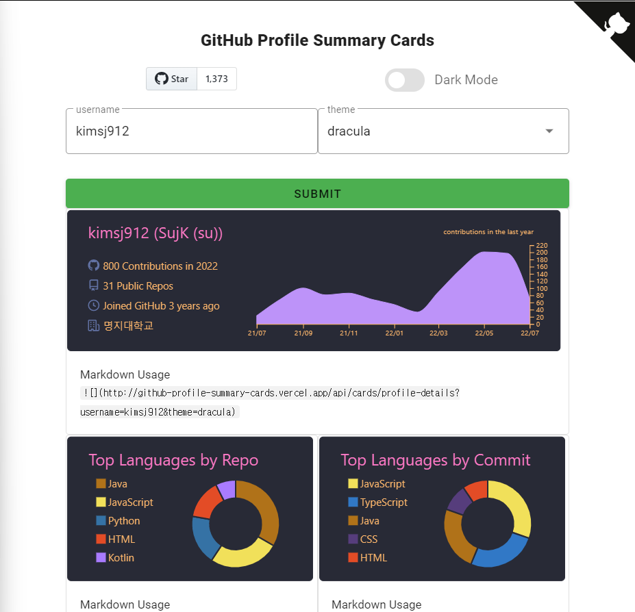 - 깃헙활용 정도를 보여주고 싶을 때 사용하기 좋다.