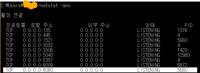 1. netstat -ano 라고 cmd에 쳐서 해당 포트번호를 사용하고 있는 프로세스의 아이디를 얻는다.