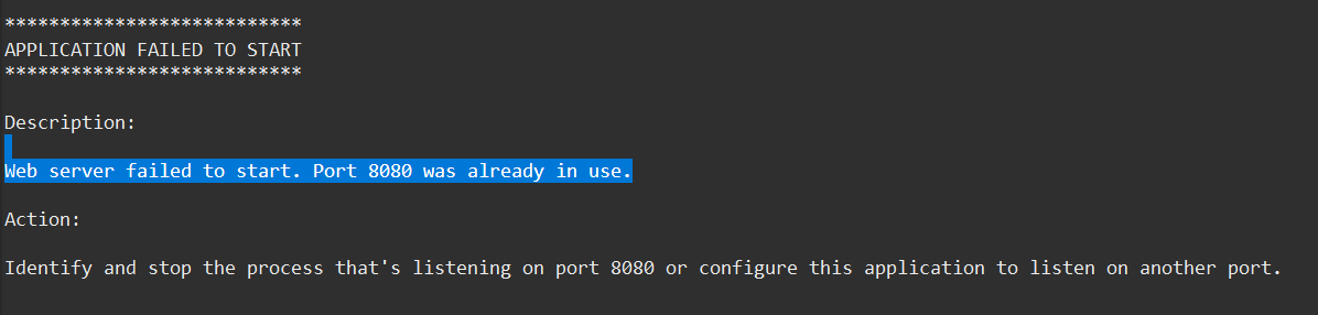 스프링이 실행되지 않은 이유는 영어의 뜻대로 내가 원했던 포트번호인 8080이 이미 사용되고 있었기 때문이다.