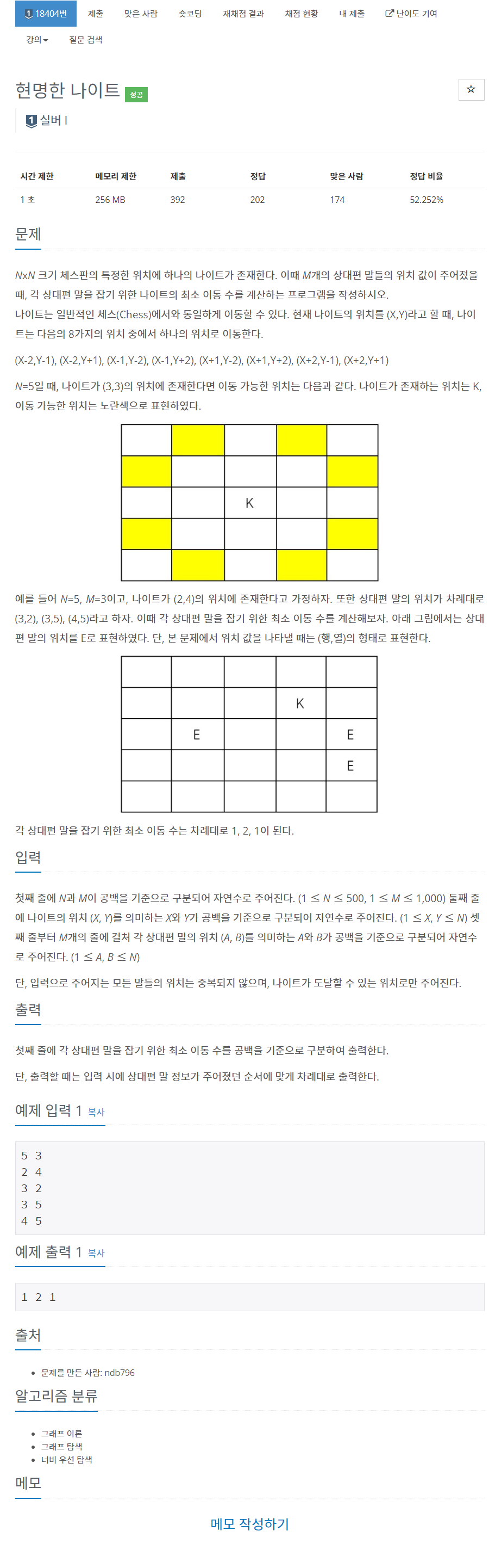 목차 개요 본문 1) 문제 2) 과정 3) 코드 전체 개요 이번에 알고리즘 스터디에서 JAVA를 이용해 백준 18404번 현명한 나이트를 풀었습니다. 이를 정리해보고자 합니다. 18404번: 현명한 나이트 첫째 줄에 N과 M이 공백을 기준으로 구분되어 자연수로 주어진다. (1 ≤ N ≤ 500, 1 ≤ M ≤ 1,000) 둘째 줄에 나이트의 위치 (X, Y)를 의미하는 X와 Y가 공백을 기준으로 구분되어 자연수로 주어진다. ( www.acmicpc.net 본문 1) 문제 2) 과정 나이트 이동 문제 (7562)를 풀고나서 이 문제를 풀었더니 그저 7562에 출력해야할 케이스의 수가 증가한 정도의 문제였습니다. 그래도 다시한번 풀어보자 하는 마음으로 처음부터 풀었는데 결과적으론 비슷하더라구요... 더 다양..
