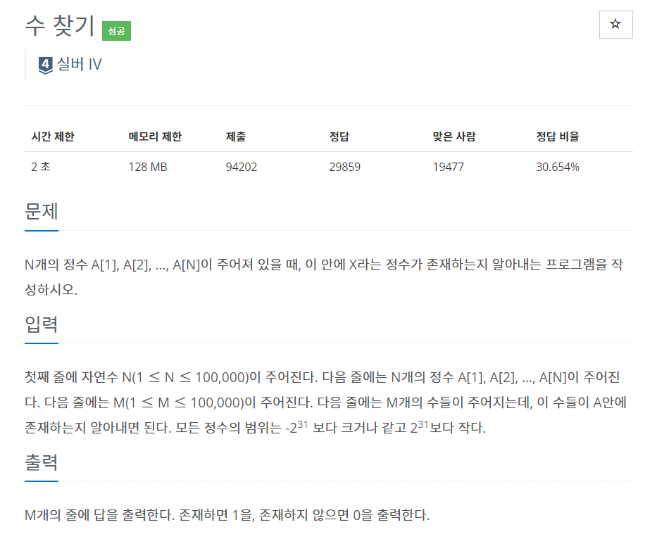 목차 개요 본문 1) 문제 2) 과정 3) 코드 전체 개요 이번 알고리즘 스터디에서 JAVA를 이용해 백준 1920번 수 찾기를 풀게 되었습니다. 1920번: 수 찾기 첫째 줄에 자연수 N(1 ≤ N ≤ 100,000)이 주어진다. 다음 줄에는 N개의 정수 A[1], A[2], …, A[N]이 주어진다. 다음 줄에는 M(1 ≤ M ≤ 100,000)이 주어진다. 다음 줄에는 M개의 수들이 주어지는데, 이 수들 www.acmicpc.net 본문 1) 문제 2) 과정 이 문제는 무난하게 40분?만에 풀었던 거 같아요. 지금껏 풀었던 문제들 중에 가장 쉬웠습니다. 문제를 얕보고 단순히 for문 2개를 돌렸더니 시간 초과가 한 번 떴던거 말곤 무난한 난이도였습니다. 코드는 기본 구조인 input, func, o..