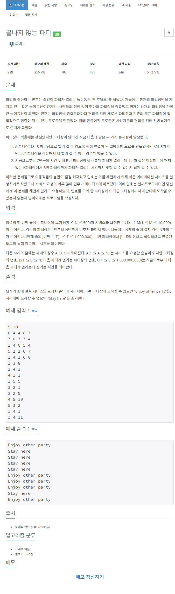 목차 개요 본문 1) 문제 2) 과정 3) 코드 전체 개요 이번에 알고리즘 스터디에서 JAVA를 이용해 백준 11265번 끝나지 않는 파티를 풀었습니다. 이를 정리해보고자 합니다. 11265번: 끝나지 않는 파티 입력의 첫 번째 줄에는 파티장의 크기 N(5 ≤ N ≤ 500)과 서비스를 요청한 손님의 수 M(1 ≤ M ≤ 10,000) 이 주어진다. 각각의 파티장은 1번부터 N번까지 번호가 붙여져 있다. 다음에는 N개의 줄에 걸 www.acmicpc.net 본문 1) 문제 2) 과정 shortest path니까 다익스트라 알고리즘을 사용하면 되겠지 싶었는데, 자꾸 시간초과가 발생하길래 다른 방법을 찾다 해당 문제를 플로이드 와샬 알고리즘으로 풀어야한단걸 알게되었습니다... 처음엔 오히려 다 구하면 오래 ..