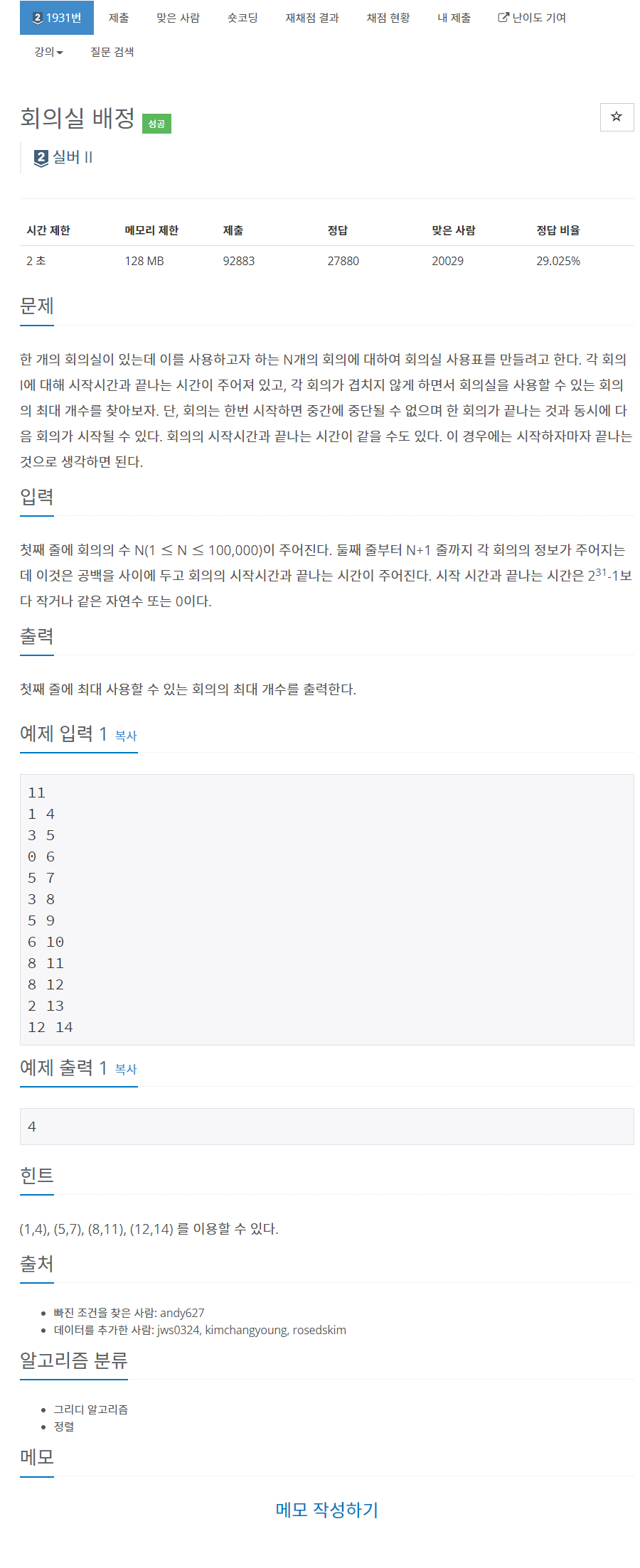 목차 개요 본문 1) 문제 2) 과정 3) 코드 전체 개요 이전에 알고리즘 스터디에서 JAVA를 이용해 백준 1931번 회의실 배정을 풀었습니다. 이를 정리해보고자 합니다. 1931번: 회의실 배정 (1,4), (5,7), (8,11), (12,14) 를 이용할 수 있다. www.acmicpc.net 본문 1) 문제 2) 과정 푸는데 꽤 시간이 들었던 문제였습니다. 1시간에서 2시간 정도 시간이 들었던 것 같네요! 이번엔 main에서 input과 func를 불러 실행이 되도록 했는데, 이번엔 Time이라는 클래스를 만들어 한 회의의 시간 타임을 사용할 수 있도록 했습니다. 2-1) main // Attribute private static int n; private static Time[] timeArr..