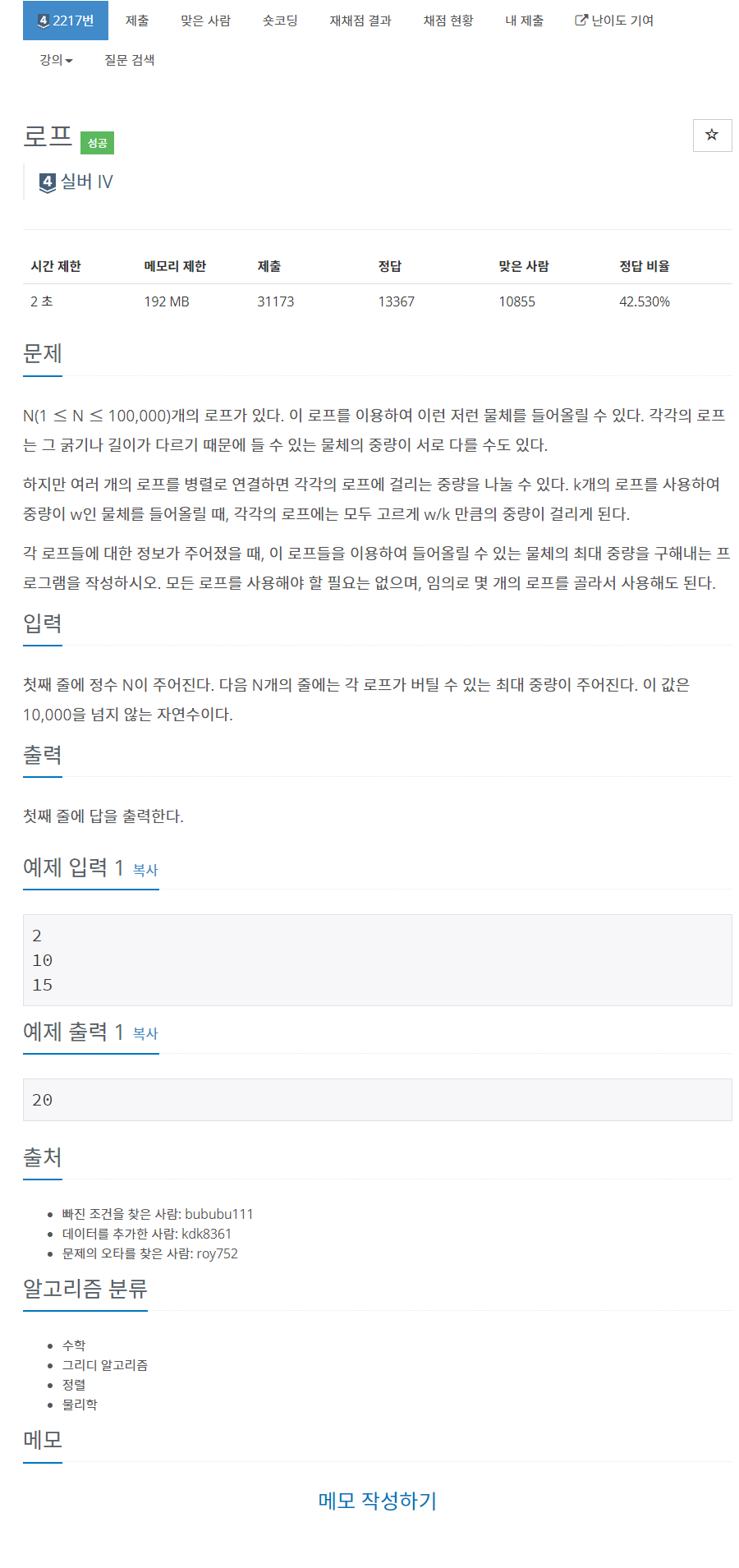 목차 개요 본문 1) 문제 2) 과정 3) 코드 전체 개요 이전에 알고리즘 스터디에서 JAVA를 이용해 백준 2217번 로프를 풀었습니다. 이를 정리해보고자 합니다. 2217번: 로프 N(1 ≤ N ≤ 100,000)개의 로프가 있다. 이 로프를 이용하여 이런 저런 물체를 들어올릴 수 있다. 각각의 로프는 그 굵기나 길이가 다르기 때문에 들 수 있는 물체의 중량이 서로 다를 수도 있다. 하 www.acmicpc.net 본문 1) 문제 2) 과정 그리 오래걸리진 않았던 문제입니다. 30분?에서 1시간 정도 사용했던 것 같아요. 이번엔 2-1) main에 모든 설명을 적어뒀습니다. 이를 참고해주세요! 2-1) main public static void main(String[] args) throws IOEx..