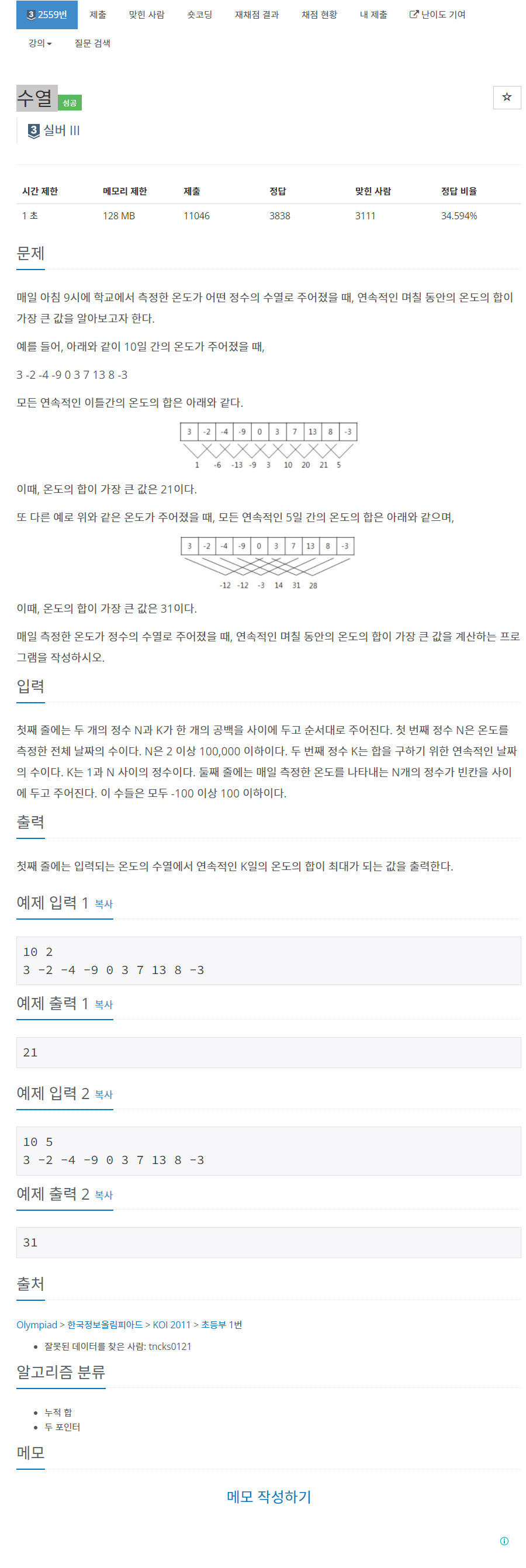 목차 개요 본문 1) 문제 2) 과정 3) 코드 전체 개요 이번에 알고리즘 스터디에서 JAVA를 이용해 백준 2559번 수열을 풀었습니다. 이를 정리해보고자 합니다. 2559번: 수열 첫째 줄에는 두 개의 정수 N과 K가 한 개의 공백을 사이에 두고 순서대로 주어진다. 첫 번째 정수 N은 온도를 측정한 전체 날짜의 수이다. N은 2 이상 100,000 이하이다. 두 번째 정수 K는 합을 구하기 www.acmicpc.net 본문 1) 문제 2) 과정 이중 for문 방식으로 풀고 싶었는데 자꾸 틀렸다고 떠서 방식을 바꿔 해결한 문제입니다. 푸는데는 3시간 정도 걸렸고 체감 난이도는 꽤 높았습니다.. n일 중에 연속되는 k일의 온도 합이 가장 컸을때의 온도합구하기가 문제의 핵심이라 생각하고 문제를 풀었고, 제..