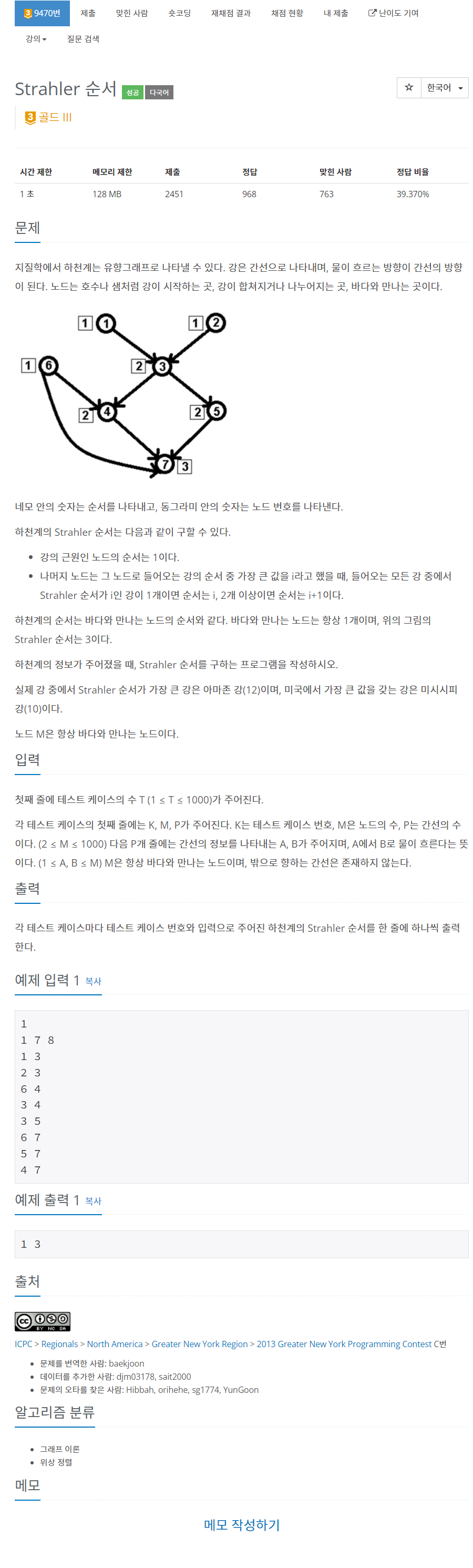 목차 개요 본문 1) 문제 2) 과정 3) 코드 전체 개요 이번에 알고리즘 스터디에서 JAVA를 이용해 백준 9470번 Strahler 순서를 풀었습니다. 이를 정리해보고자 합니다. 9470번: Strahler 순서 지질학에서 하천계는 유향그래프로 나타낼 수 있다. 강은 간선으로 나타내며, 물이 흐르는 방향이 간선의 방향이 된다. 노드는 호수나 샘처럼 강이 시작하는 곳, 강이 합쳐지거나 나누어지는 곳 www.acmicpc.net 본문 1) 문제 2) 과정 5시간에 걸쳐서 풀었던 위상정렬 문제입니다... 기본 위상정렬 문제에 strahler 순서에 따른 조건이 추가되어 문제를 이해하고 만드는데 어려움을 겪었던 문제였어요... "나머지 노드는 그 노드로 들어오는 강의 순서 중 가장 큰 값을 i라고 했을 때,..