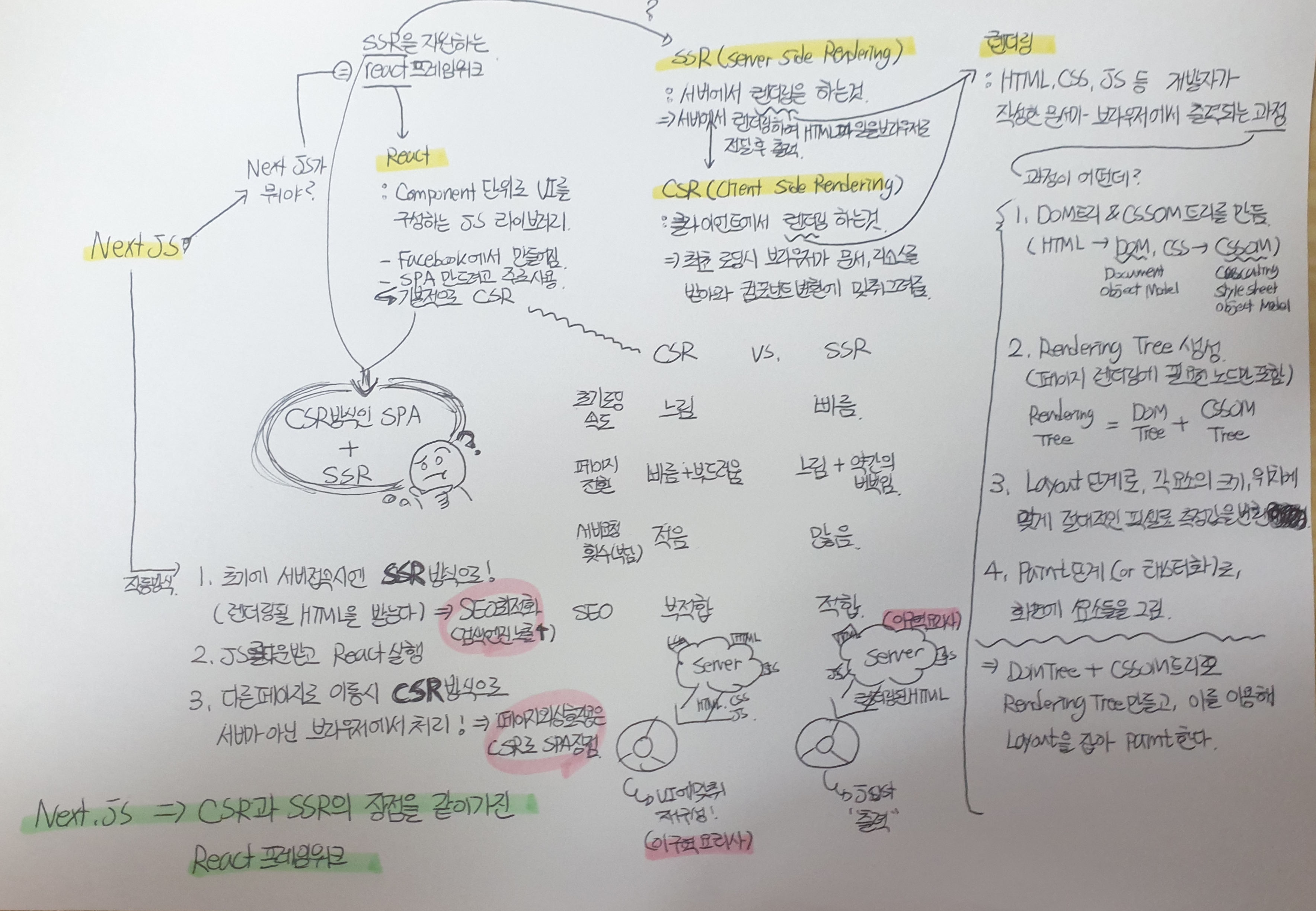 개요 next JS를 공부하려고 노마드 코더 인강을 틀었는데 nextJS에 대한 제대로 된 설명 없이 바로 실습으로 들어가려고 하시길래 "nextJS가 일단 뭔데...?"라는 생각으로 검색을 시작해봤습니다. 본론 기본 주제 : next JS가 무엇인가? nextJS는 SSR을 지원하는 react 프레임워크입니다. 여기서 SSR과 React의 개념을 조금 짚고 넘어가려고 합니다. React란 무엇인가? react는 페이스북에서 만든 컴포넌트 단위로 UI를 구성할 수 있게 한 자바스크립트 라이브러리를 말한다. 기본적으로 SPA(Single Page Application)를 지원하며 CSR 방식으로 화면을 전환한다. SSR(Server Side Rendering)과 CSR(Client Side Renderin..